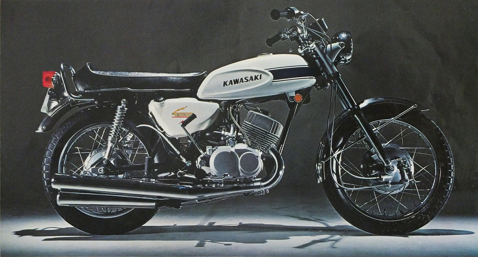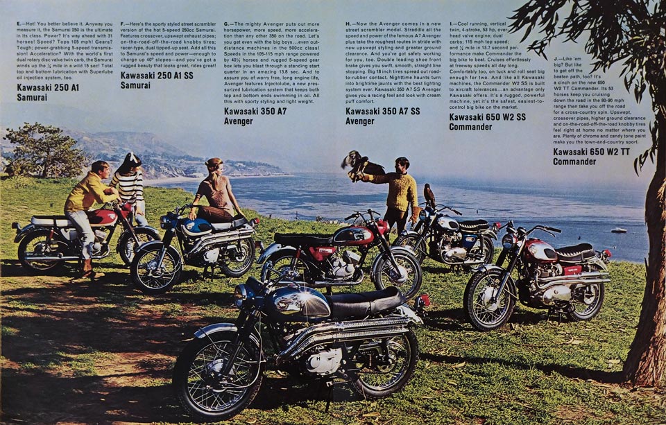 Auch Suzuki mit der T20 mischte mit, ebenfalls ein 2-Zylinder-2-Takter. Hier bahnte sich eine neue Generation ihren Weg. Zu dieser Zeit wollten die wenigsten gemütlich über die Landstraßen fahren, nein, da wollten viele am Gas drehen. Dafür war die Kawasaki-W1 nicht zu haben. Kawasaki hatte den Trend dieser Zeit erkannt und brachte 1966 die A1 Samurai, einen 2-Zylinder-2-Takter mit 250 ccm und 31 PS auf den Markt. Ein Jahr später, 1967, folgte die A7 Avanger, ebenfalls ein 2-Zylinder-2-Takt-Motor mit 350 ccm und 42 PS.