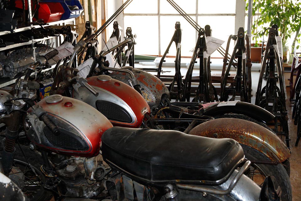 Insgesamt wurden die Kawasaki-W-Modelle 26.289 Mal gebaut, davon 639 Scrambler. Ralf Gille hat in seinem Bestand nicht nur komplette Motorräder, Rahmen und Motoren der W1 und W2-Reihe, er ist auch im Besitz einiger W2-TT-Scrambler, sodass das ein oder andere Modell auf Wunsch aufgebaut werden kann.